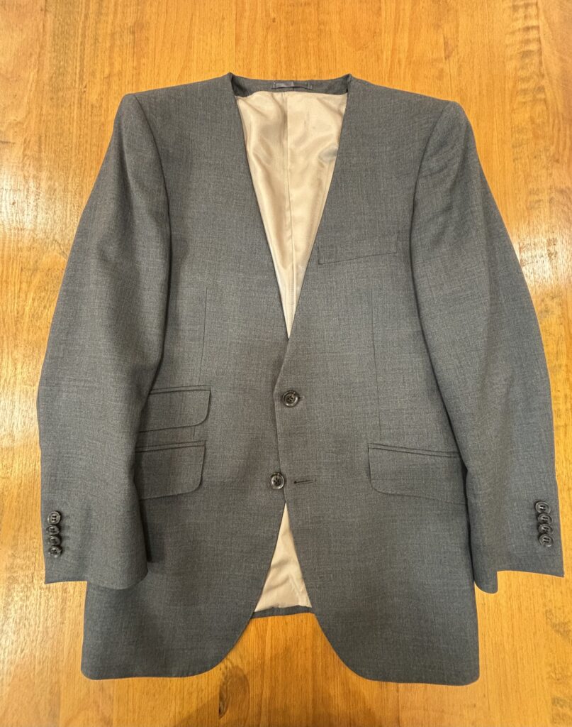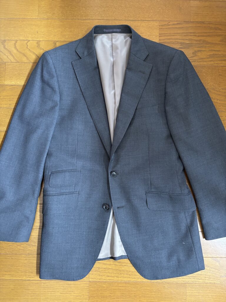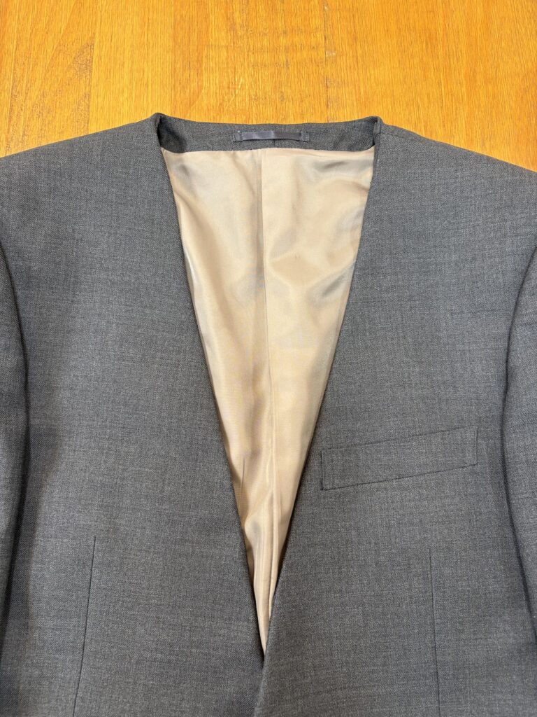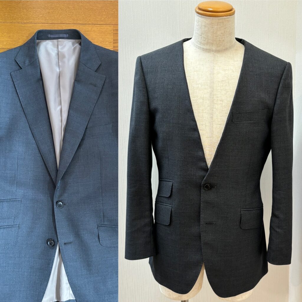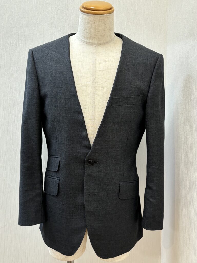 メンズのテーラードジャケットをノーカラーにリメイクです。