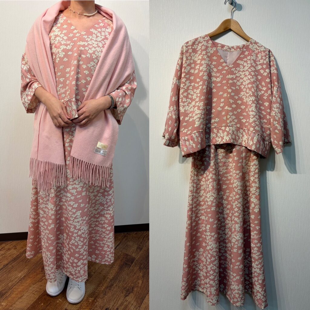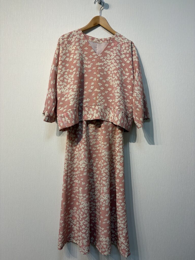 2026.04.05 オーダー シンプルな着物リメイク 春らしい桜色の桜の柄物です。プルオーバーと6枚剥スカートお仕立てしています。 スカートはできるだけ長い方がいいとの事でした。ほぼ全てを利用しています。身頃の袖は長さが足りず継いでいますが目立ちません。デザインはシンプルですが利用しやすいのではないでしょうか。 前の記事へ 一覧へ戻る